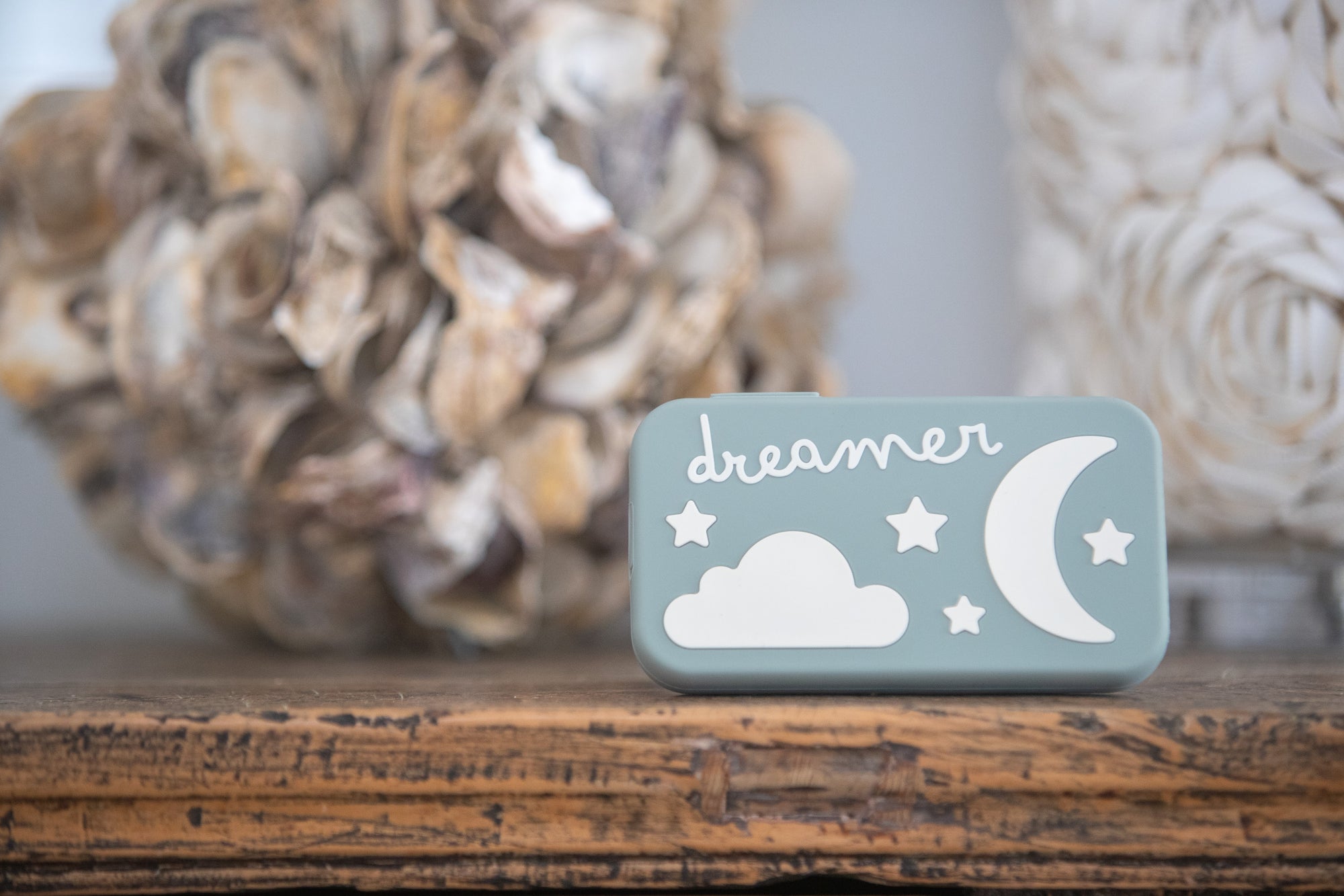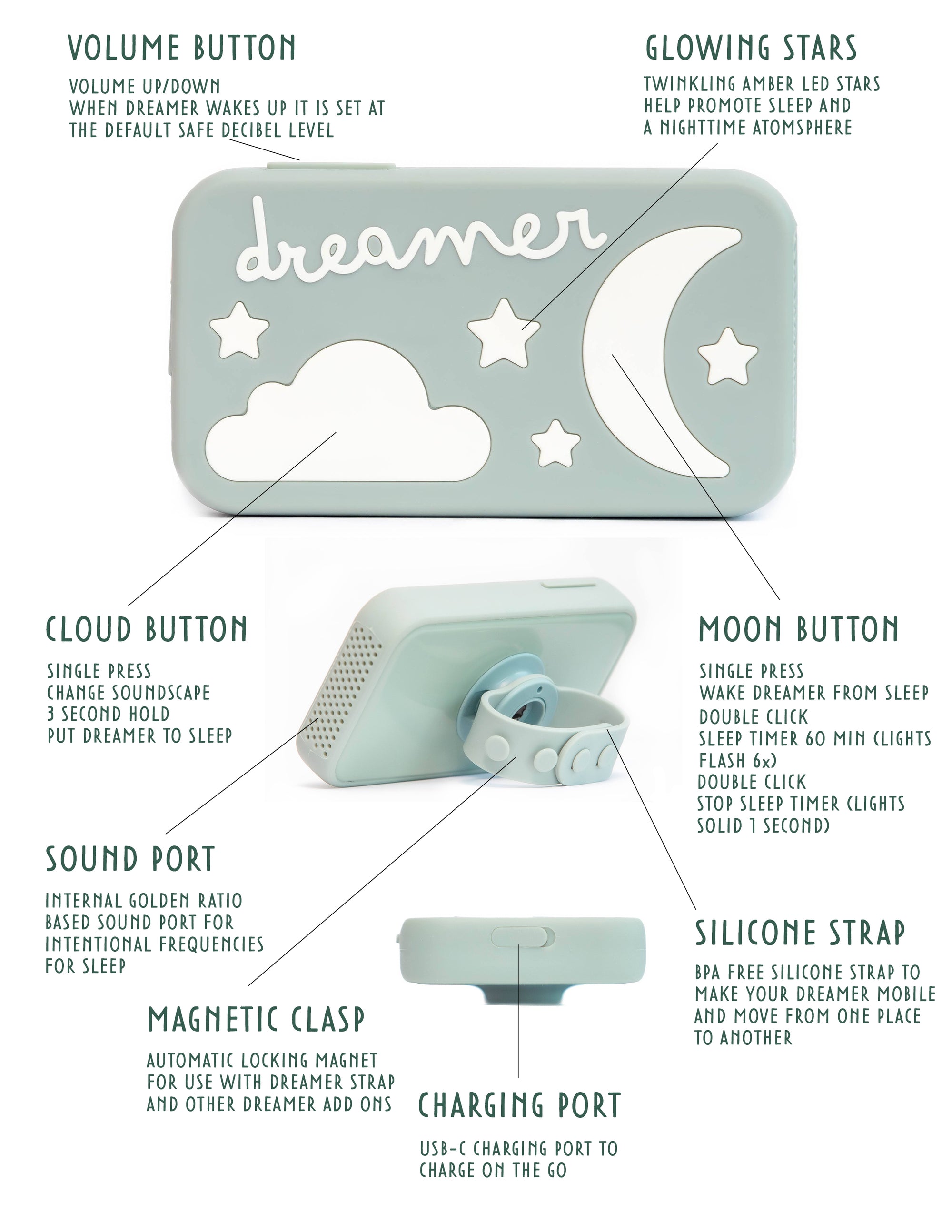 Dreamer's Silicone Strap and Magnetic Clasp make attaching to any object, and adapting any moment a breeze. Whether going for a run, a late night car ride, or a beautiful addition to the nursery, Dreamer keeps bedtime consistent no matter where life takes you.