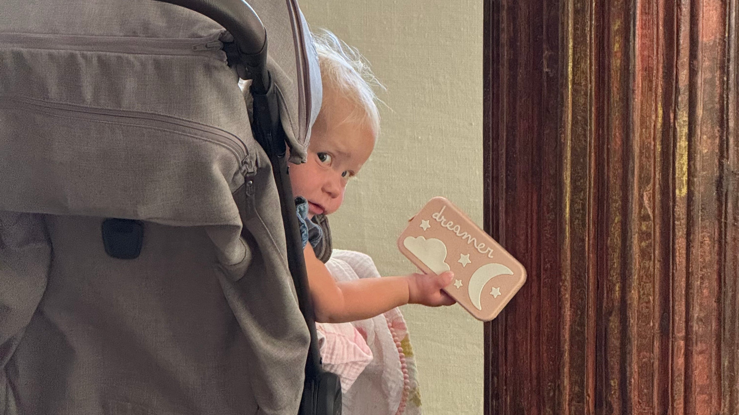 Easily attach The Dreamer to cribs, strollers, or car seats with our innovative magnetic clasp and proprietary silicone strap. Designed for convenience and secure attachment.